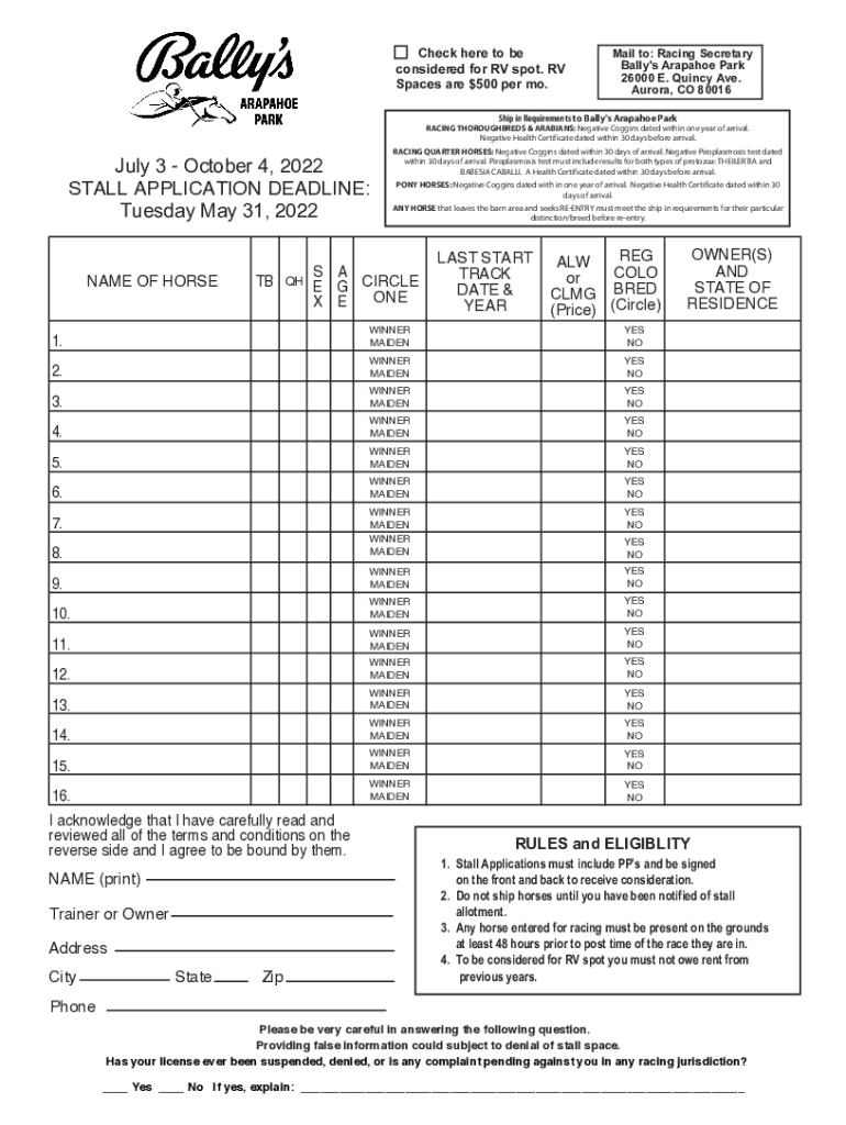 Check here to be considered for RV spot. RV Spaces are $500 per mo. Mail to: Racing Secretary Bally\'s Arapahoe Park 26000 E. Quincy Ave. Aurora, CO 80016Ship in Requirements to Bally\'s Arapahoe
