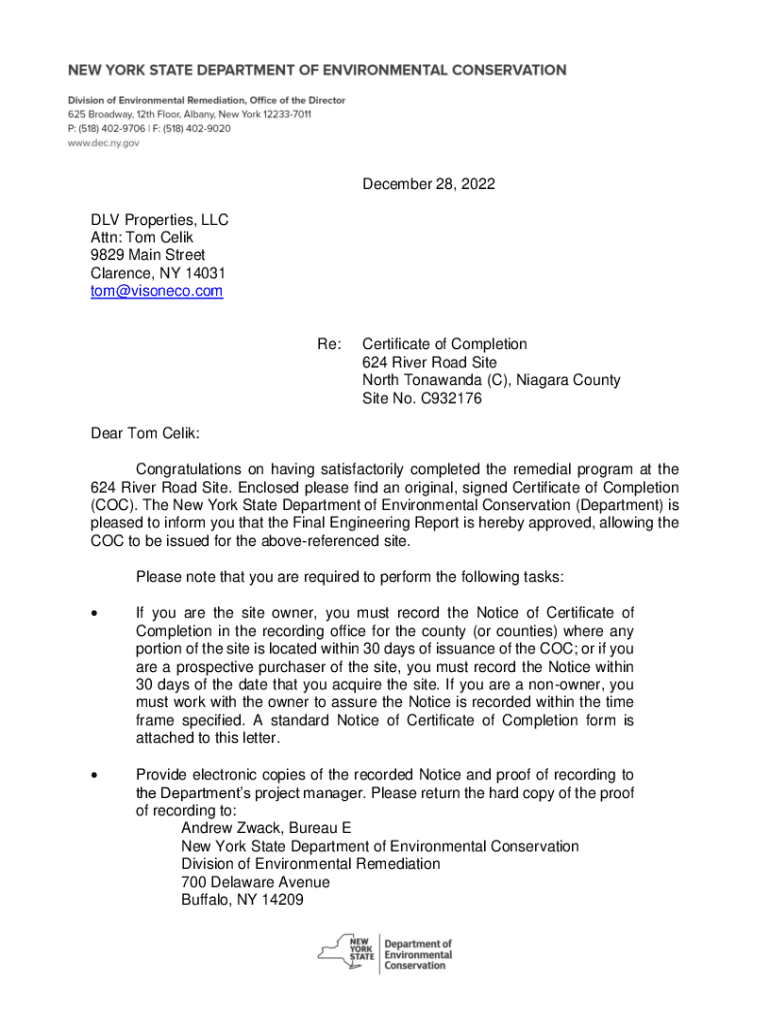 December 28, 2022, DL Properties, LLC Attn: Tom Celia 9829 Main Street Clarence, NY 14031 tom@visoneco.comRe:Certificate of Completion 624 River Road Site North Lawanda (C), Niagara County Site No.