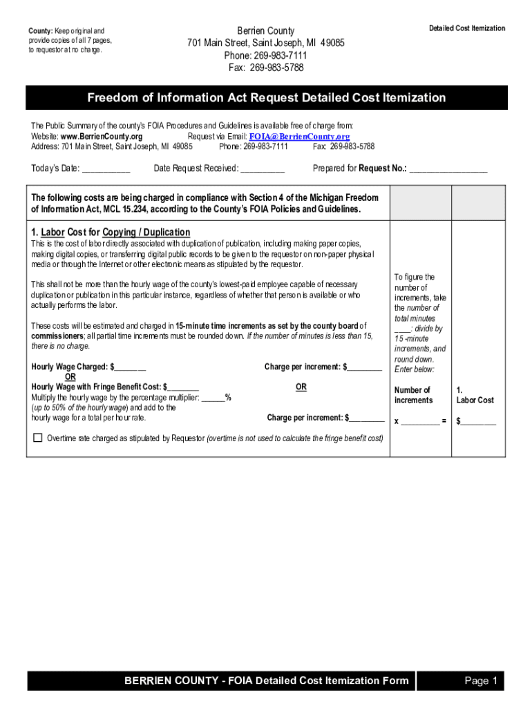 Detailed Cost ItemizationBerrien County 701 Main Street, Saint Joseph, MI 49085 Phone: 2699837111 Fax: 2699835788County: Keep original and provide copies of all 7 pages, to requestor at no charge.