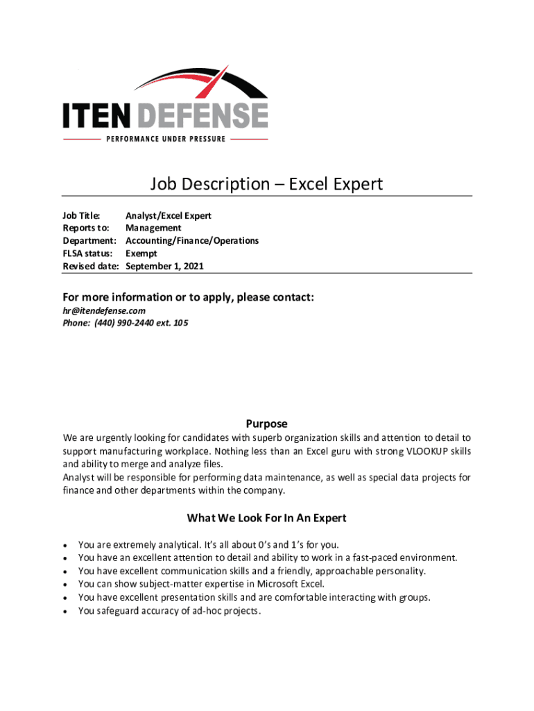 Job Description Excel Expert Job Title: Reports to: Department: FLEA status: Revised date:Analyst/Excel Expert Management Accounting/Finance/Operations Exempt September 1, 2021For more information