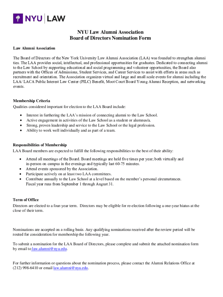 NYU Law Alumni Association Board of Directors Nomination Form Law Alumni Association The Board of Directors of the New York University Law Alumni Association (LAW) was founded to strengthen alumni