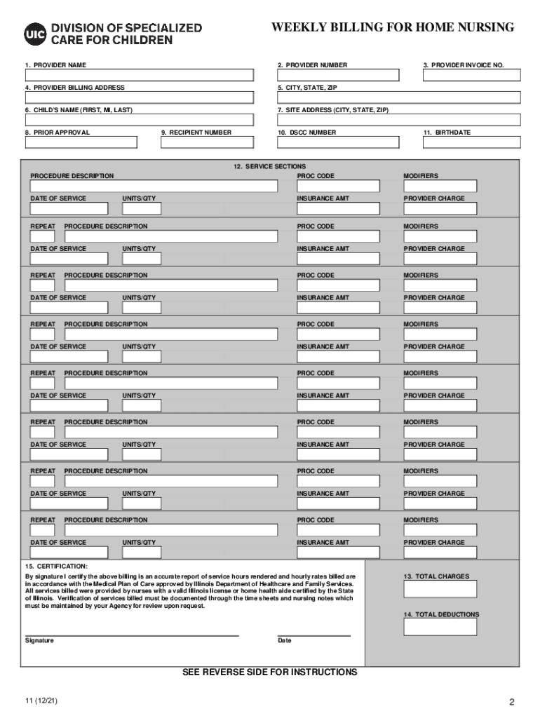WEEKLY BILLING FOR HOME NURSING GENERAL BILLING INSTRUCTIONS The University of Illinois Chicago's Division of Specialized Care for Children (DCC) operates the Home Care Program on behalf of the Department
