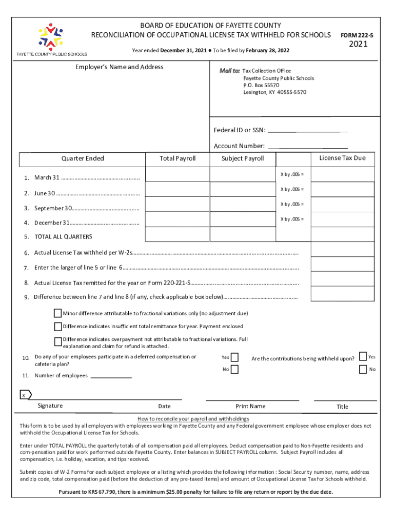 BOARD OF EDUCATION OF FAYETTE COUNTY RECONCILIATION OF OCCUPATIONAL LICENSE TAX WITHHELD FOR SCHOOLWORK 222S2021Year ended December 31, 2021, To be filed by February 28, 2022Employers Name and Addressable