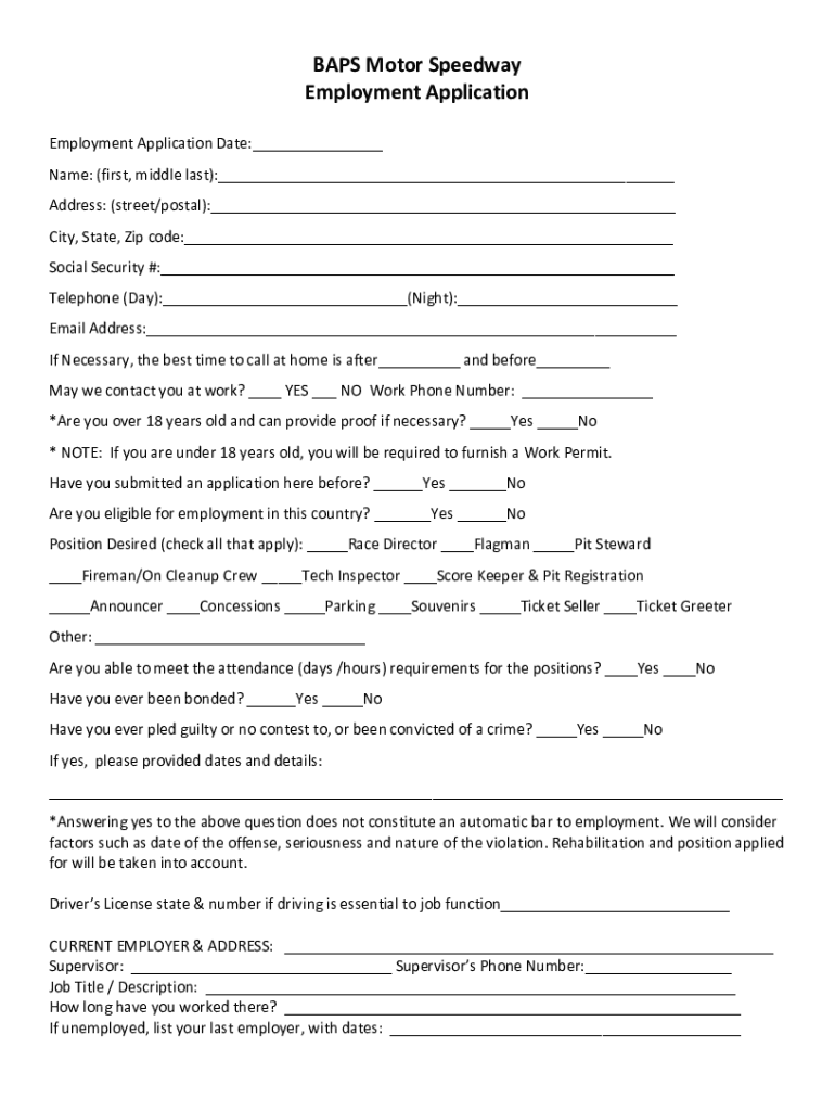 BAPS Motor Speedway Employment Application Date:___ Name: (first, middle last):___ Address: (street/postal):___ City, State, Zip code:___ Social Security #:___ Telephone (Day):___(Night):___ Email