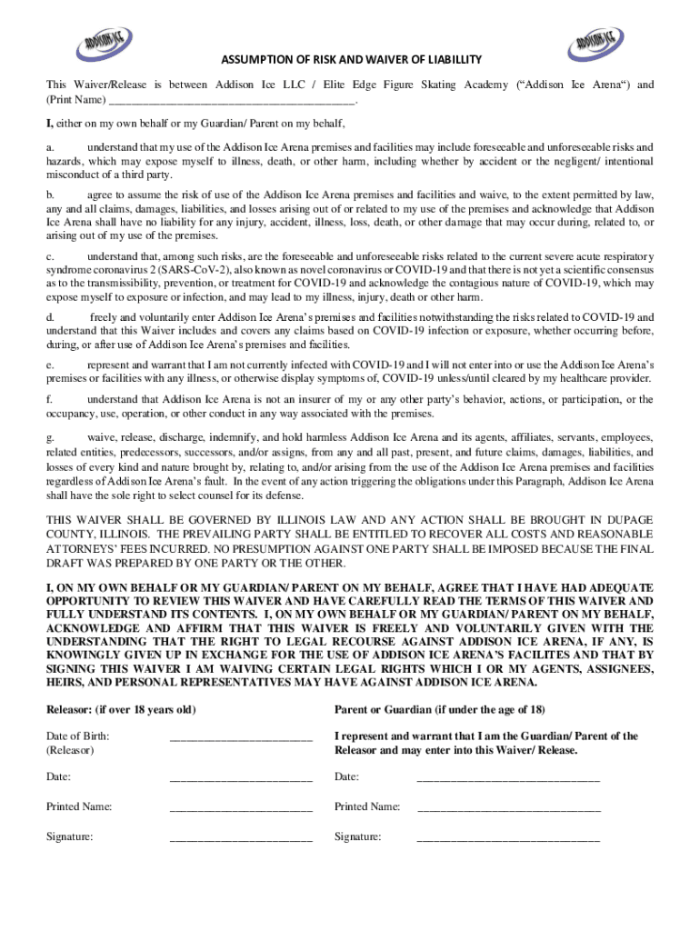 ASSUMPTION OF RISK AND WAIVER OF LIABILITY This Waiver/Release is between Addison Ice LLC / Elite Edge Figure Skating Academy (Addison Ice Arena) and (Print Name) ___. I, either on my own behalf or