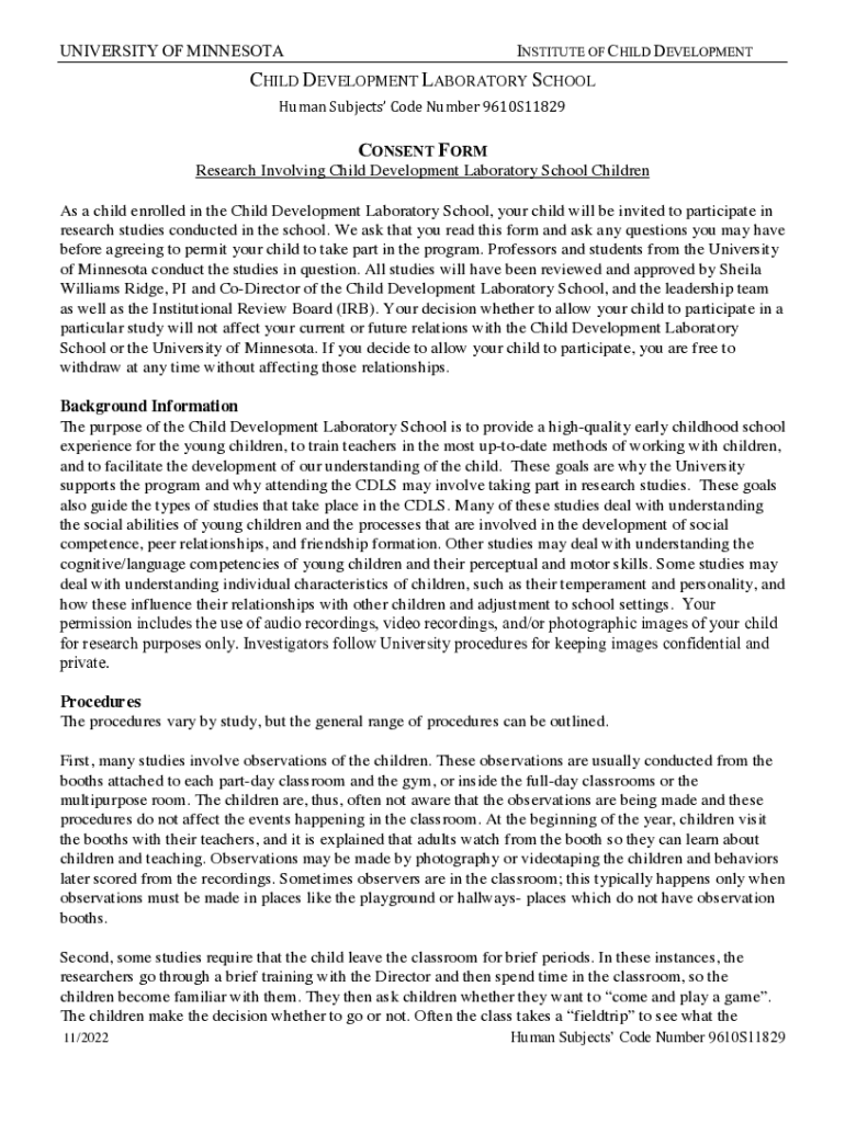 UNIVERSITY OF MINNESOTAINSTITUTE OF CHILD DEVELOPMENTCHILD DEVELOPMENT LABORATORY SCHOOL Human Subjects Code Number 9610S11829CONSENT FORM Research Involving Child Development Laboratory School Children