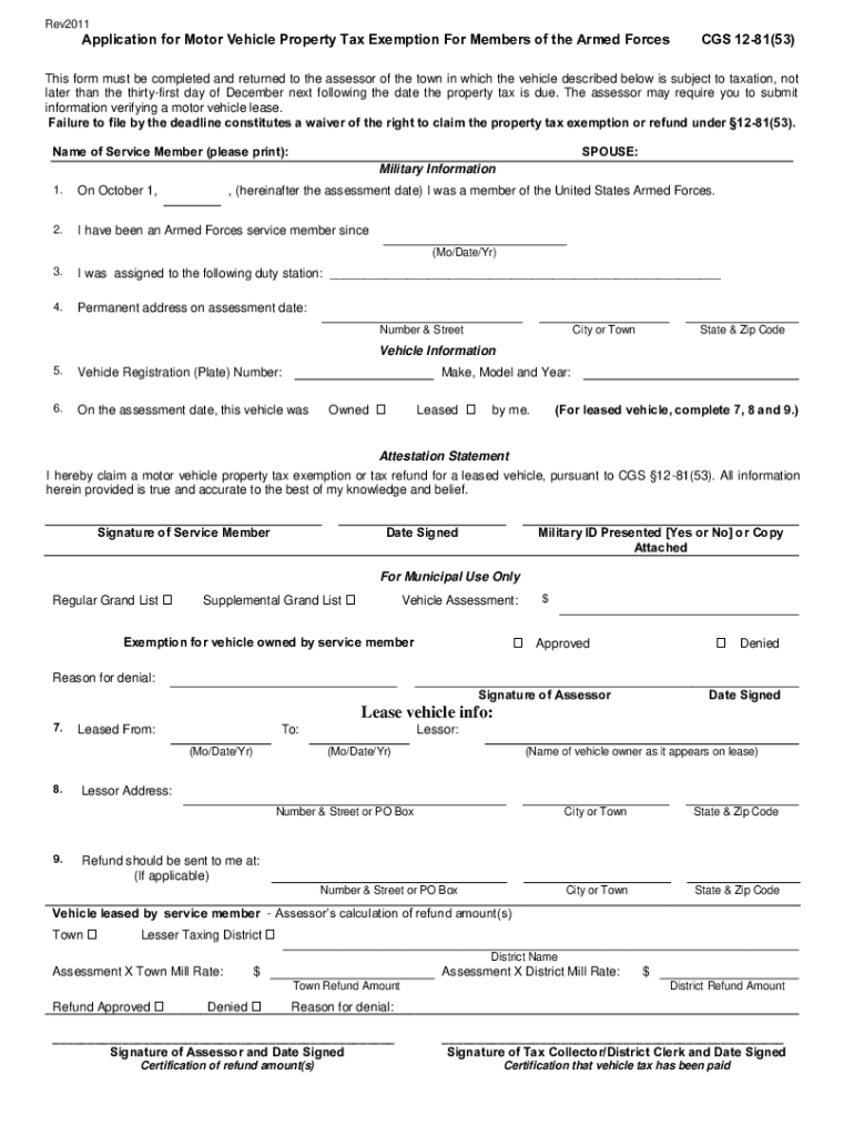 Rev2011Application for Motor Vehicle Property Tax Exemption For Members of the Armed Forces CGS 1281(53)This form must be completed and returned to the assessor of the town in which the vehicle described