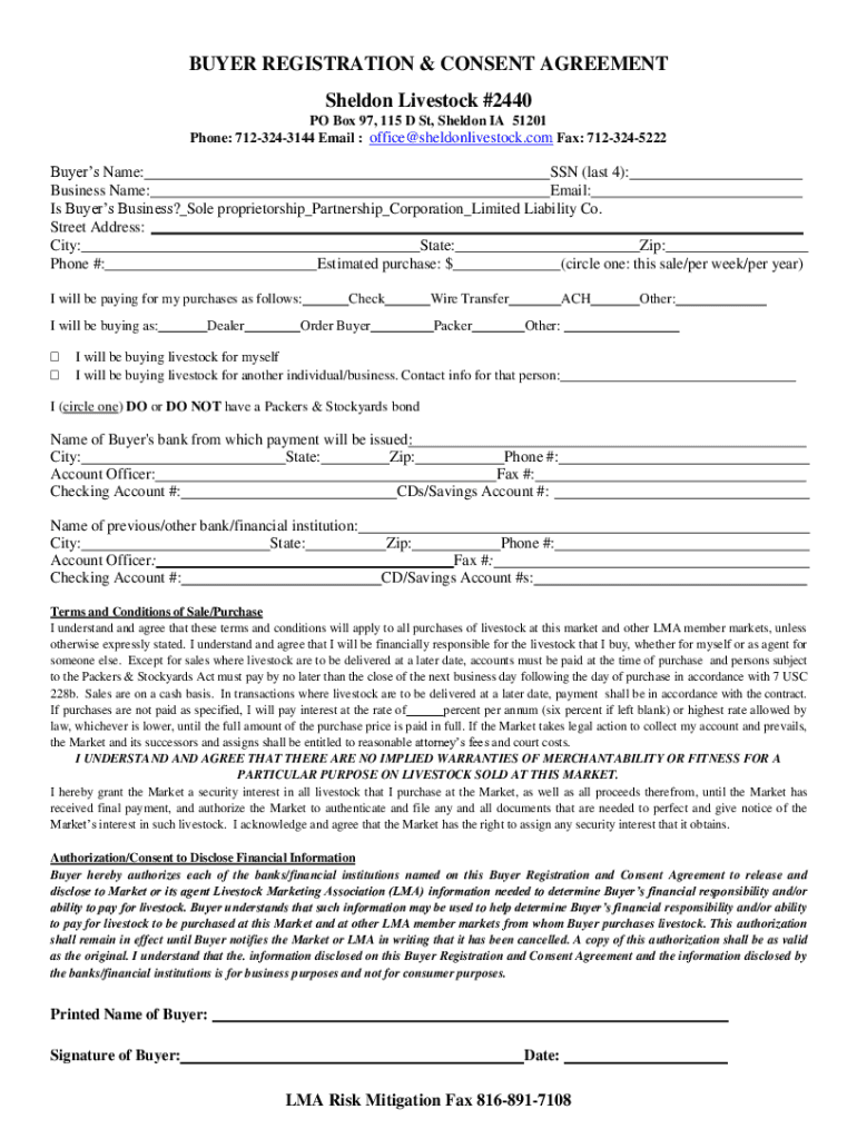 BUYER REGISTRATION & CONSENT AGREEMENT Sheldon Livestock #2440 PO Box 97, 115 D St, Sheldon IA 51201 Phone: 7123243144 Email : office@sheldonlivestock.com Fax: 7123245222Buyers Name: SSN (last 4):