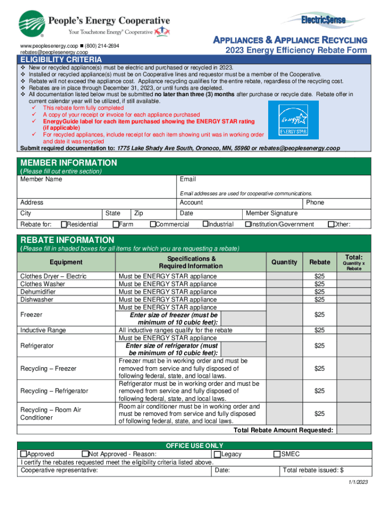 WWW.peoples energy. Coop (800) 2142694 rebates@peoplesenergy.coop2023 Energy Efficiency Rebate FormELIGIBILITY CRITERIA New or recycled appliance(s) must be electric and purchased or recycled in 2023.