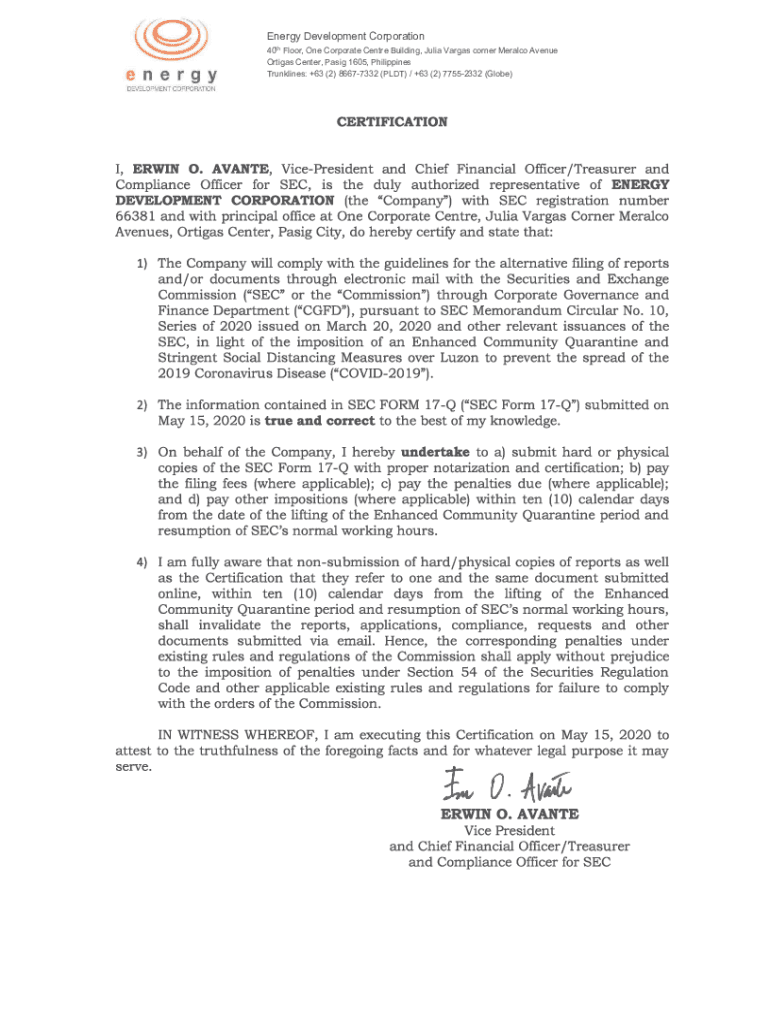 Energy Development Corporation 40th Floor, One Corporate Center Building, Julia Vargas corner Geraldo Avenue Ortega Center, PSIG 1605, Philippines Trunk lines: +63 (2) 86677332 (PLOT) / +63 (2) 77552332
