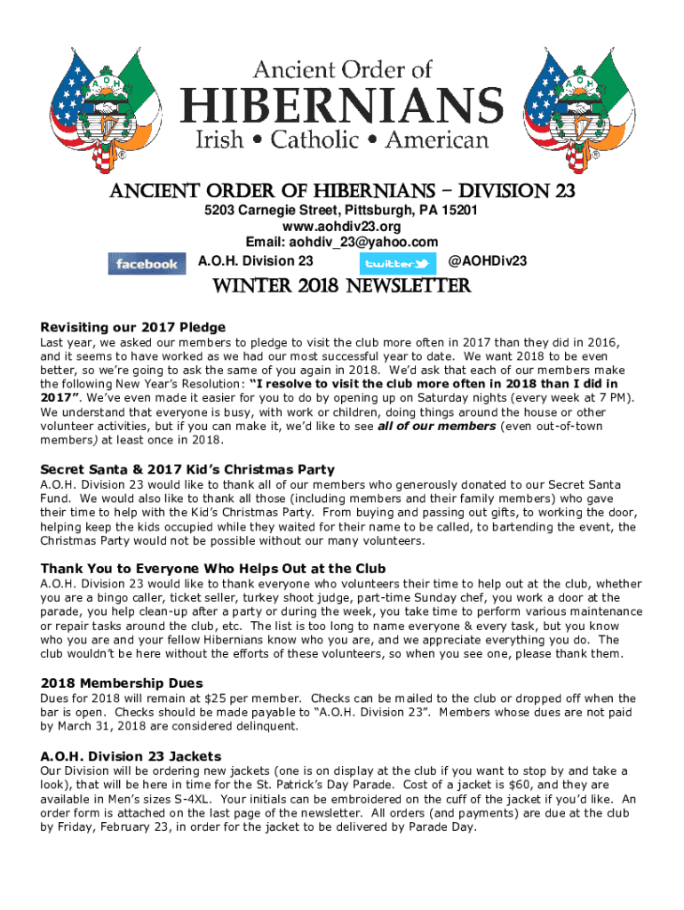 Ancient Order of Hibernian's Division 23 5203 Carnegie Street, Pittsburgh, PA 15201 www.aohdiv23.org Email: aohdiv_23@yahoo.com A.O.H. Division 23 @AOHDiv23WINTER 2018 Newsletter Revisiting our 2017