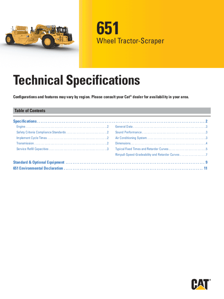 651 Wheel TractorScraper Technical Specifications Configurations and features may vary by region. Please consult your Cat dealer for availability in your area. Table of Contents Specifications. .