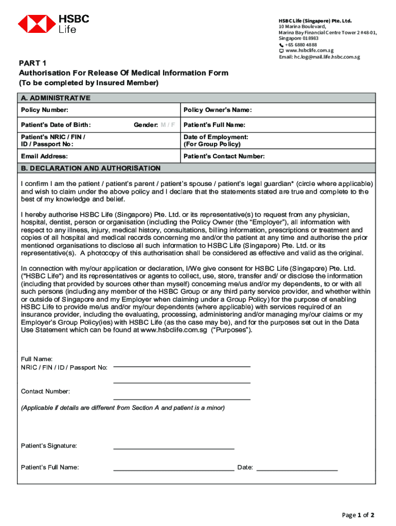 HSBC Life (Singapore) PTE. Ltd 10 Marina Boulevard, Marina Bay Financial Center Tower 2 #4801, Singapore 018983 +65 6880 4888 www.hsbclife.com.sg Email: hc.log@mail.life.hsbc.com.sgPART 1 Authorization