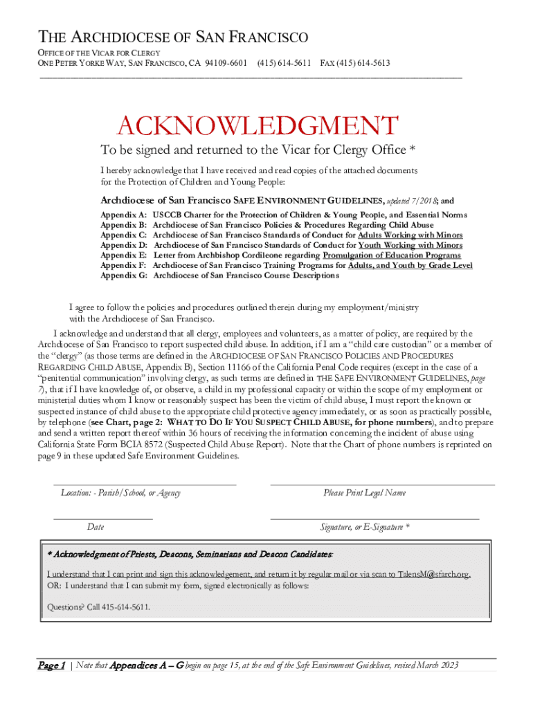 THE ARCHDIOCESE OF SAN FRANCISCO OFFICE OF THE VICAR FOR CLERGY ONE PETER YOKE WAY, SAN FRANCISCO, CA 941096601 (415) 6145611 FAX (415) 6145613 ___Acknowledgment be signed and returned to the Vicar