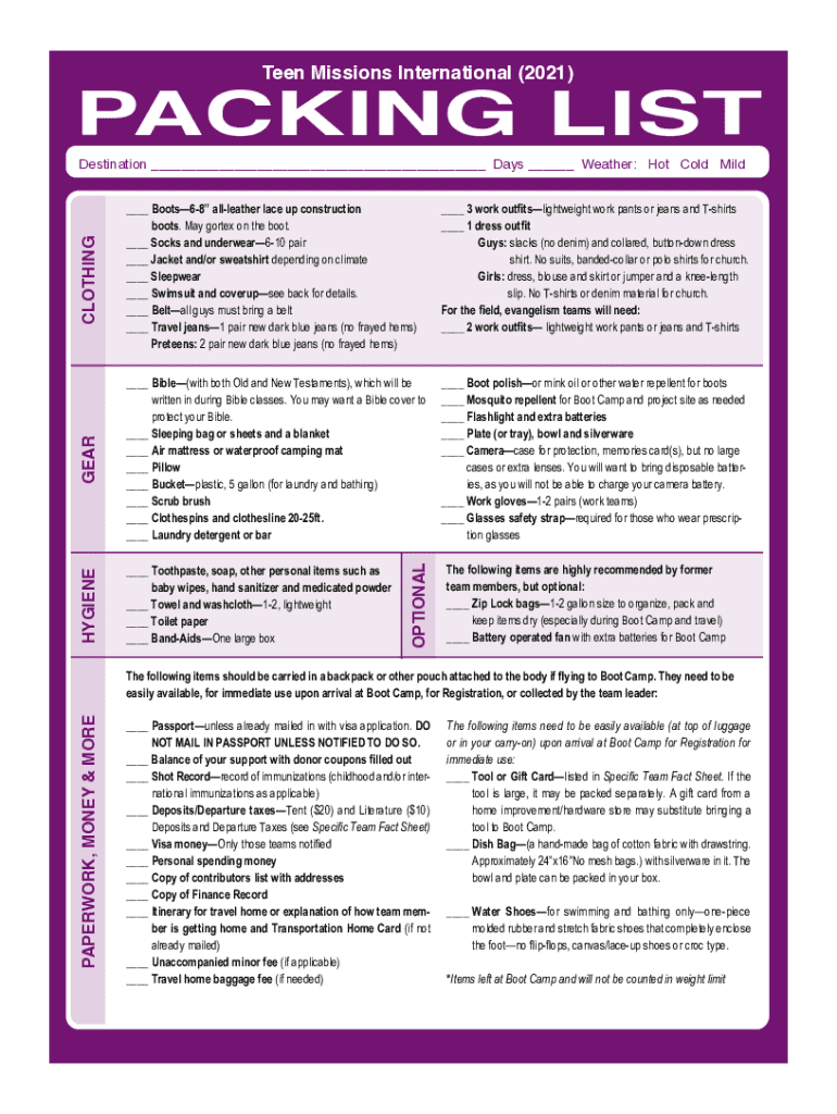 Teen Missions International (2021)PACKING LIST ___ 3 work outfits lightweight work pants or jeans and Shirts ___ 1 dress outfits: slacks (no denim) and collared, button down dress shirt. No suits,