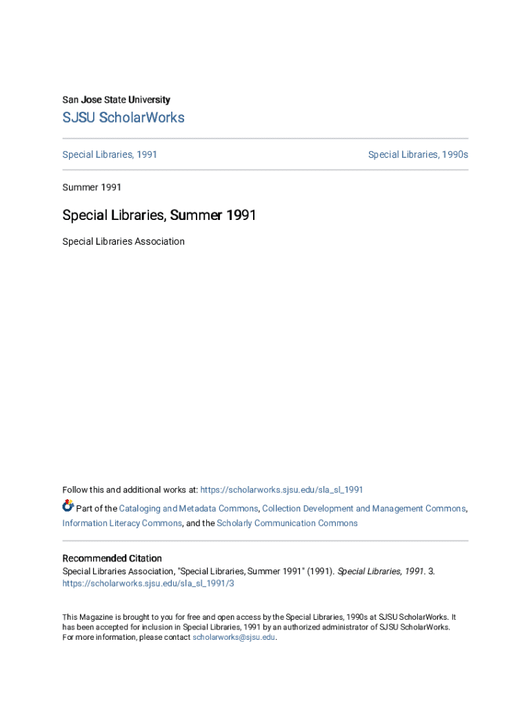 San Jose State UniversitySJSU ScholarWorks Special Libraries, 1991Special Libraries, 1990sSummer 1991Special Libraries, Summer 1991 Special Libraries AssociationFollow this and additional works at: