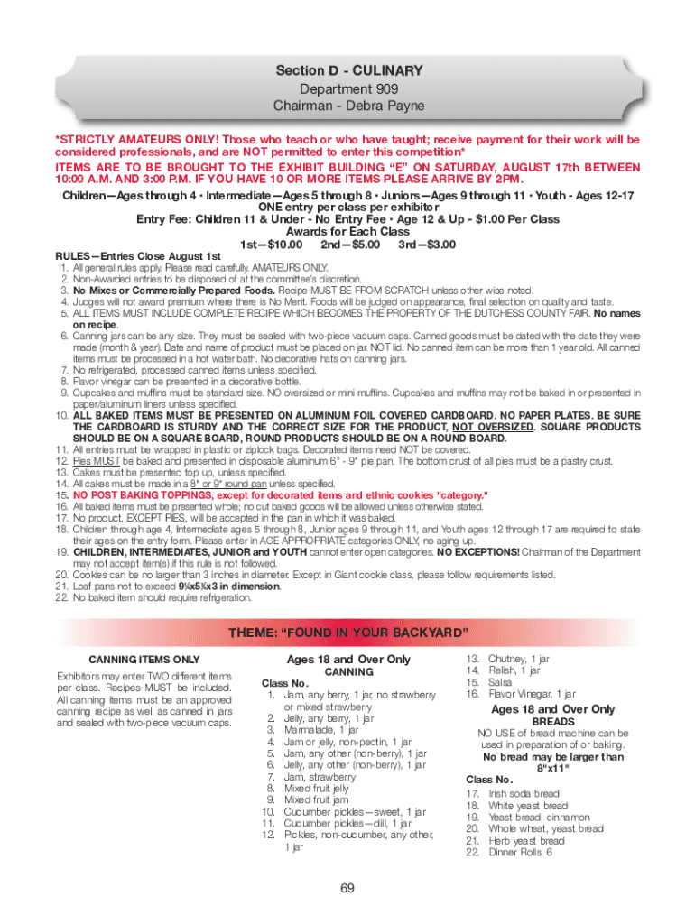 Section D CULINARY Department 909 Chairman Debra Payne *STRICTLY AMATEURS ONLY! Those who teach or who have taught; receive payment for their work will be considered professionals, and are NOT permitted