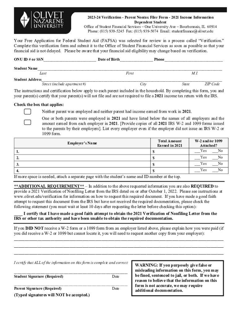 202324 Verification Parent Nontax Filer Form 2021 Income Information Dependent Student Office of Student Financial Services One University Ave Bourbons, IL 60914 Phone: (815) 9395245 Fax: (815) 9395074