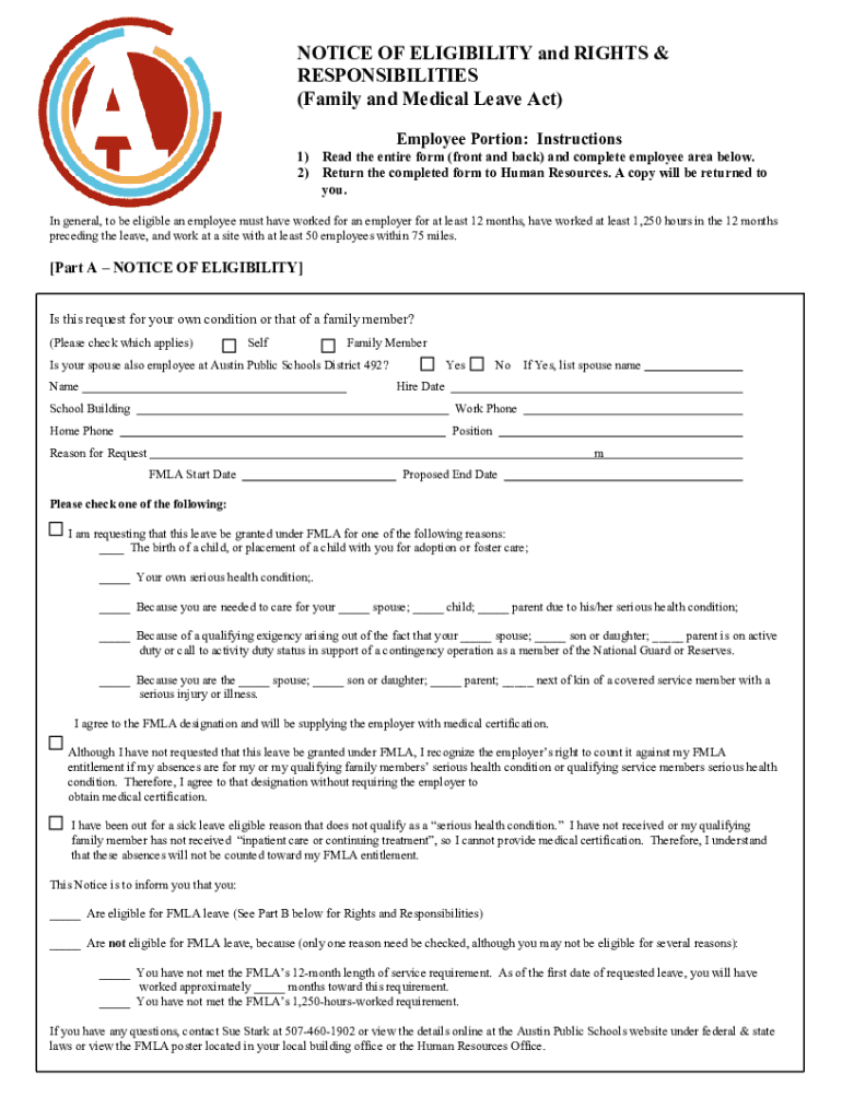 NOTICE OF ELIGIBILITY and RIGHTS & RESPONSIBILITIES (Family and Medical Leave Act) Employee Portion: Instructions1) Read the entire form (front and back) and complete employee area below. 2) Return