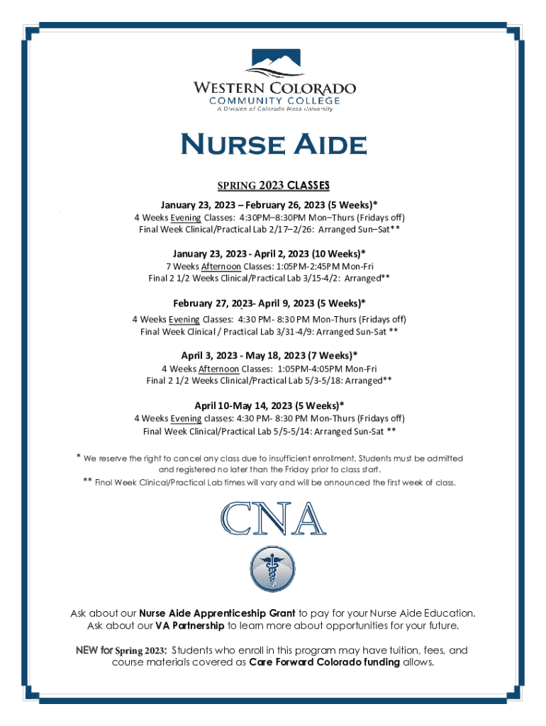 Nurse Aide SPRING 2023 CLASSES: January 23, 2023, February 26, 2023 (5 Weeks)*4 Weeks Evening Classes: 4:30PM8:30PM Mon Thurs (Fridays off) Final Week Clinical/Practical Lab 2/172/26: Arranged Sunset**January