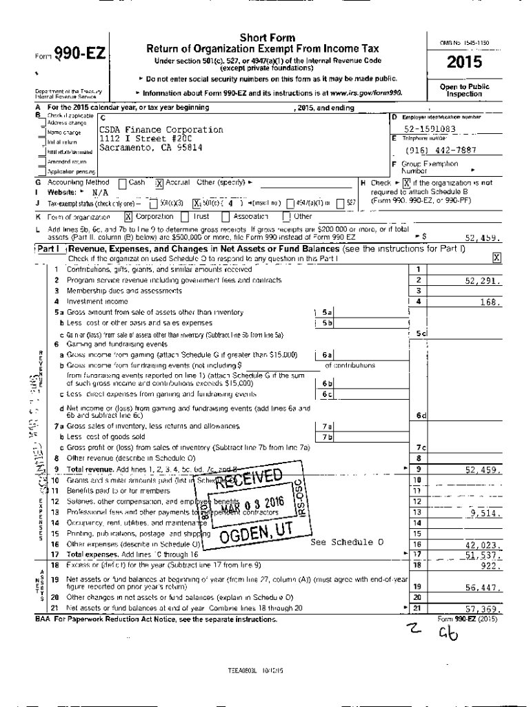 Short Form Return of Organization Exempt From Income Reinform 990\'Department of the Treasury Internal Revenue ServiceNow the 2015 calendar year, or tax year beginningBCheck if applicable Address