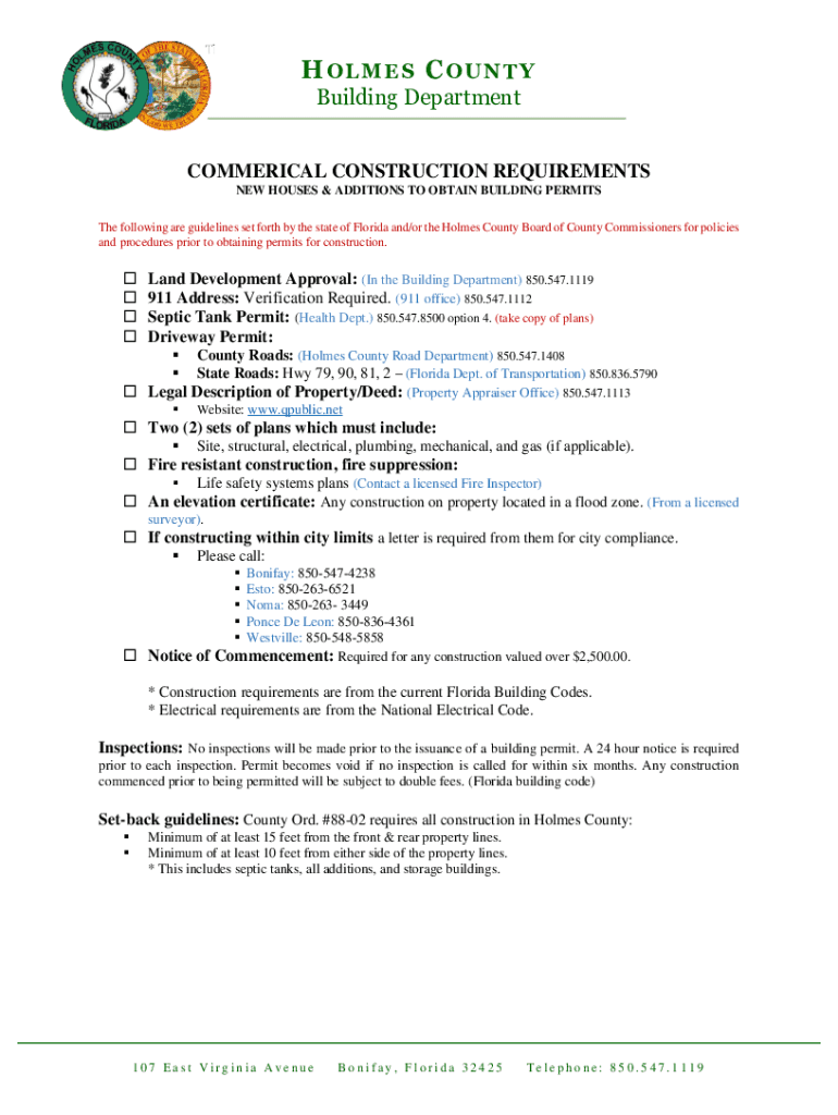 HOLMES COUNTY Building Department COMMERCIAL CONSTRUCTION REQUIREMENTS NEW HOUSES & ADDITIONS TO OBTAIN BUILDING PERMITS The following are guidelines set forth by the state of Florida and/or the Holmes