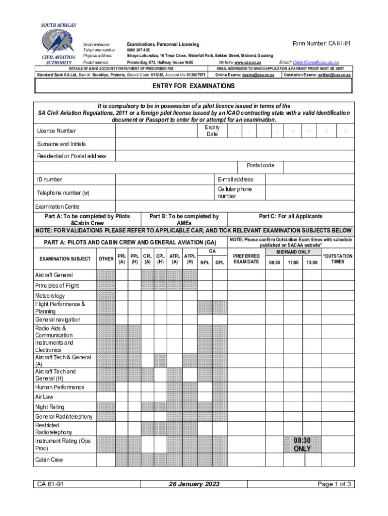 Physical address:Examinations, Personnel LicensingPostal address:Private Bag X73, Halfway House 1685Form Number: CA 61910860 267 435