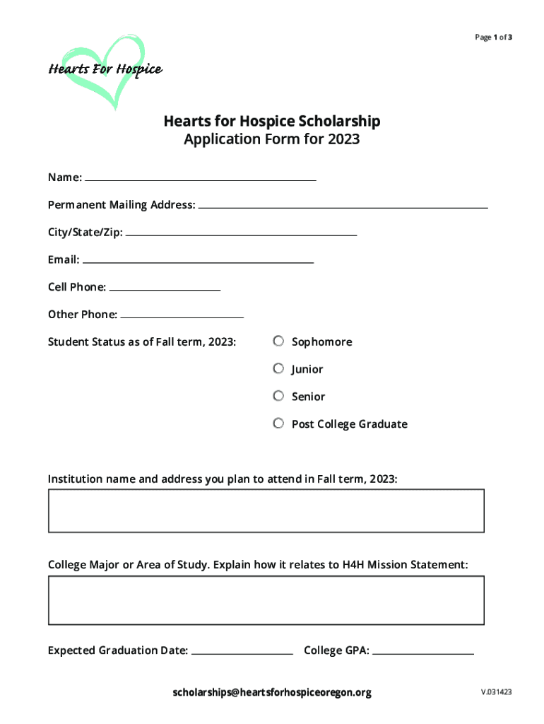 Page 1 of 3Hearts for Hospice Scholarship Application Form for 2023 Name: Permanent Mailing Address: City/State/Zip: Email: Cell Phone: Other Phone: Student Status as of Fall term, 2023:Sophomore