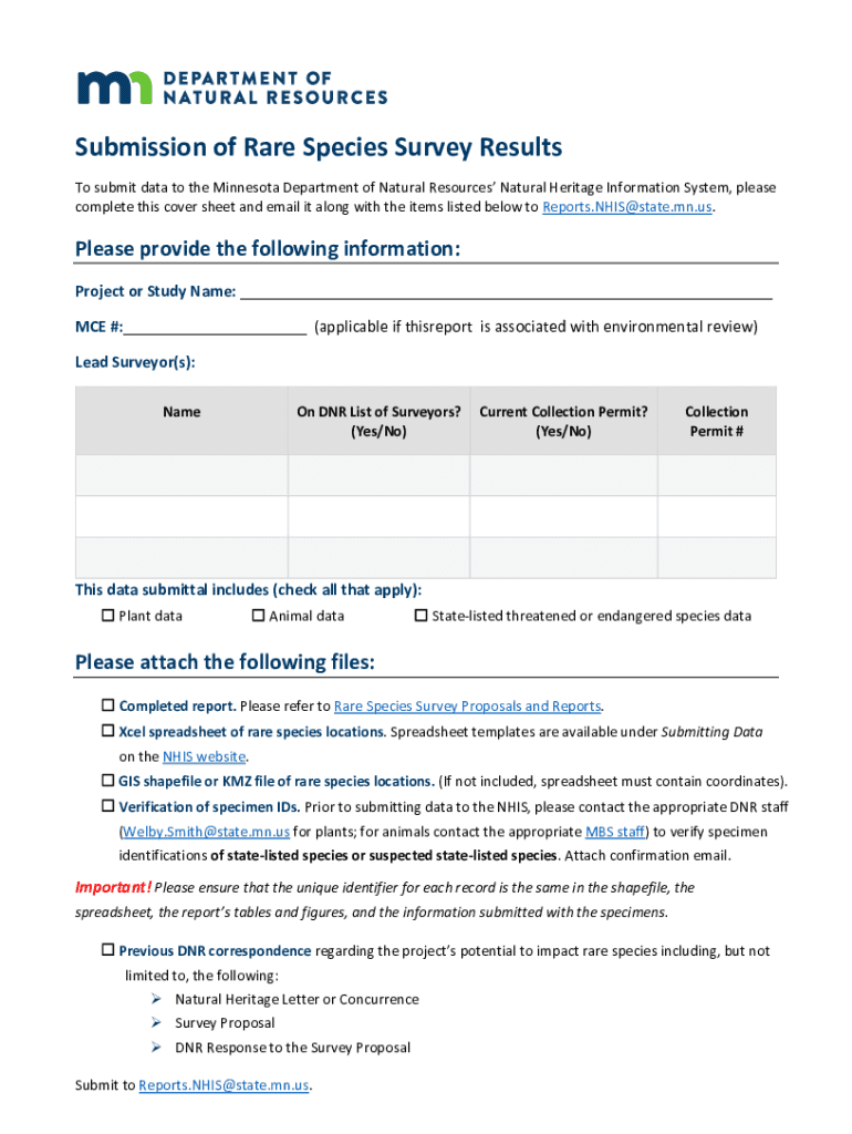 Submission of Rare Species Survey Results To submit data to the Minnesota Department of Natural Resources Natural Heritage Information System, please complete this cover sheet and email it along with