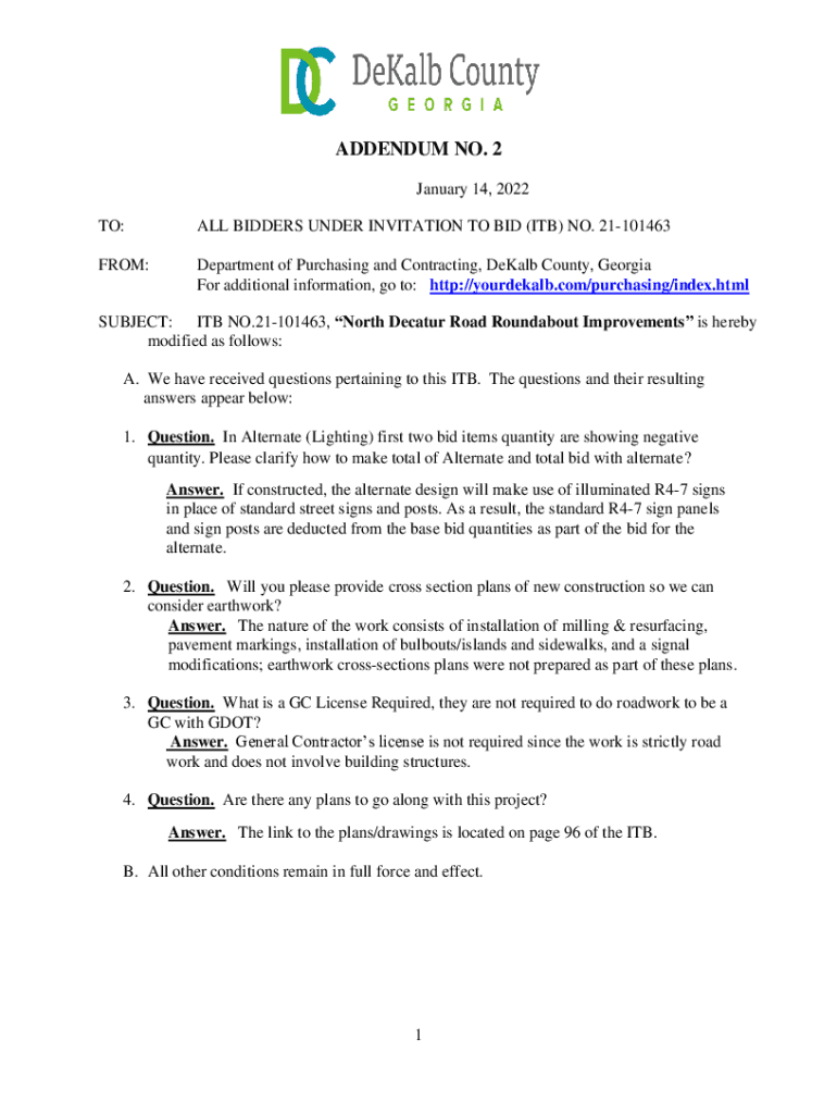 ADDENDUM NO. 2 January 14, 2022, TO:ALL BIDDERS UNDER INVITATION TO BID (ITB) NO. 21101463FROM:Department of Purchasing and Contracting, DeKalb County, Georgia For additional information, go to: http://yourdekalb.com/purchasing/index.htmlSUBJECT: