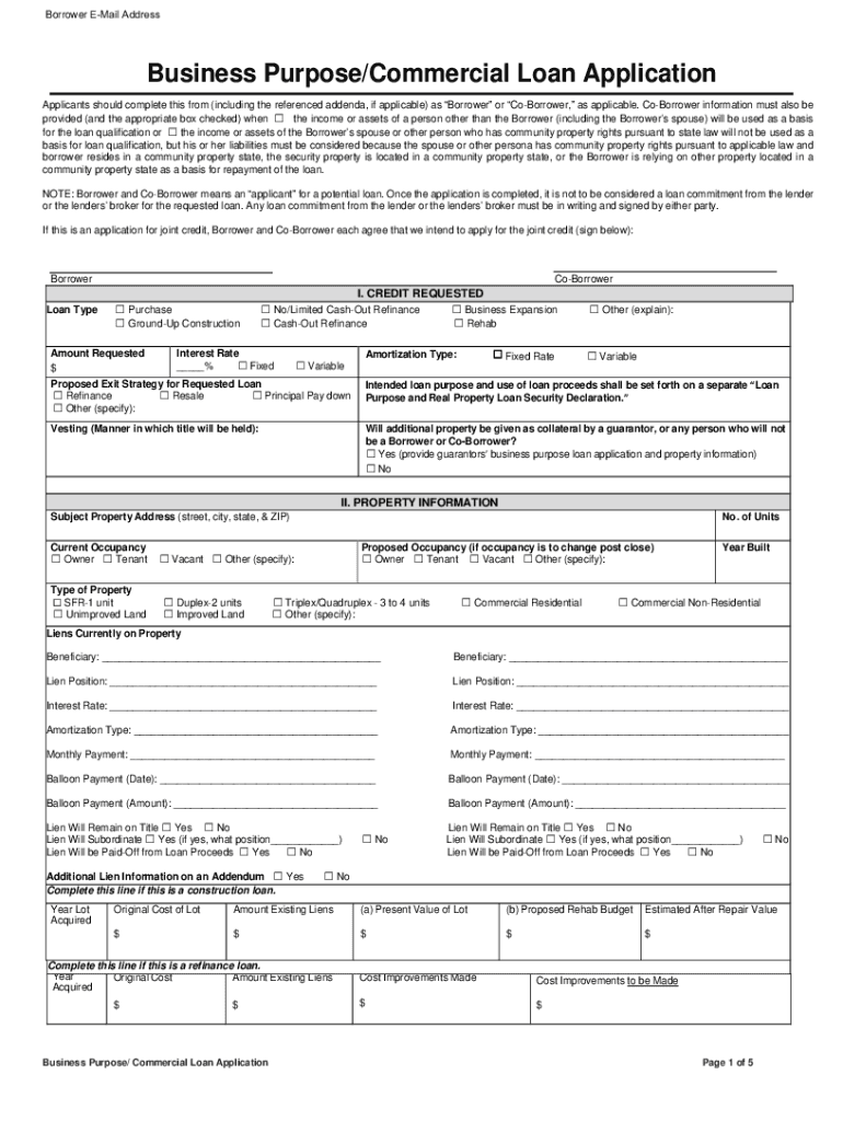 Borrower Email AddressBusiness Purpose/Commercial Loan Application Applicants should complete this from (including the referenced addenda, if applicable) as Borrower or Borrower, as applicable. Borrower
