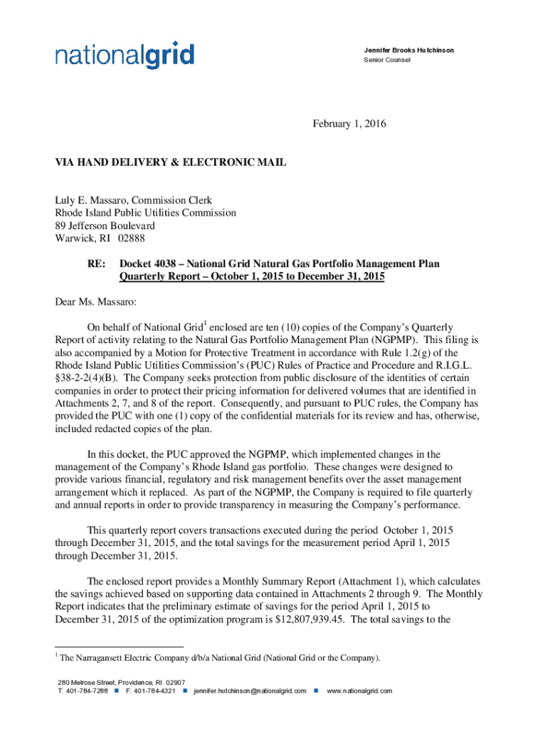 Senior Counsel February 1, 2016VIA HAND DELIVERY & ELECTRONIC Maillol E. Massacre, Commission Clerk