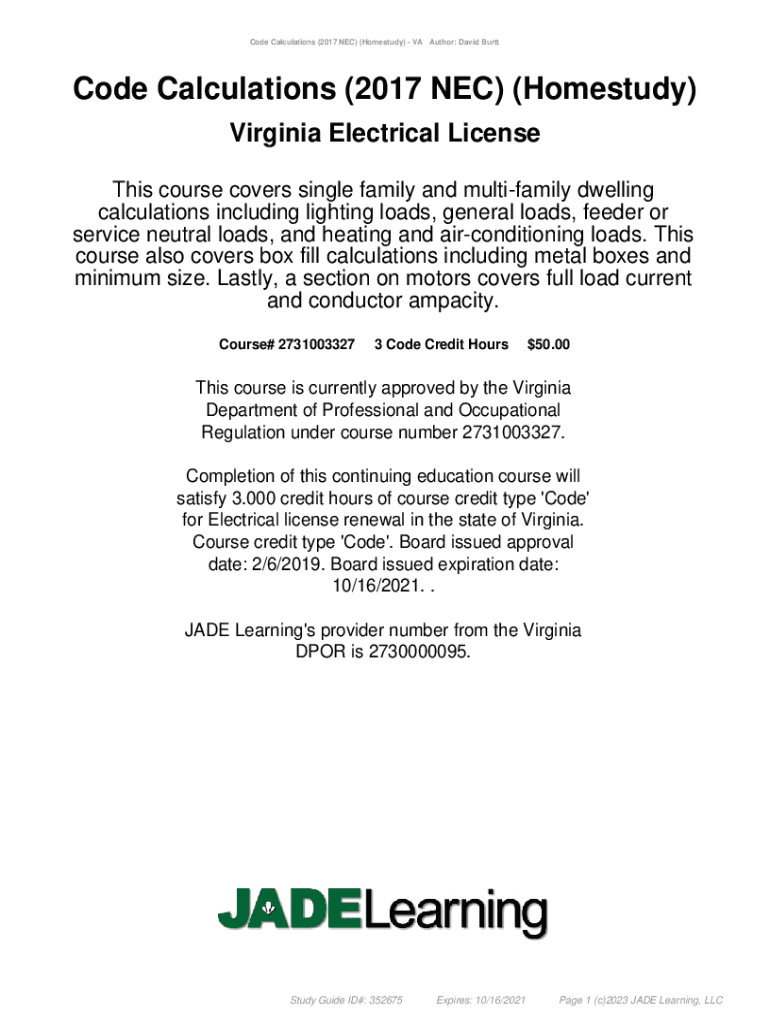 Code Calculations (2017 NEC) (Home study) VA Author: David Barcode Calculations (2017 NEC) (Home study) Virginia Electrical License This course covers single family and multifamily dwelling calculations