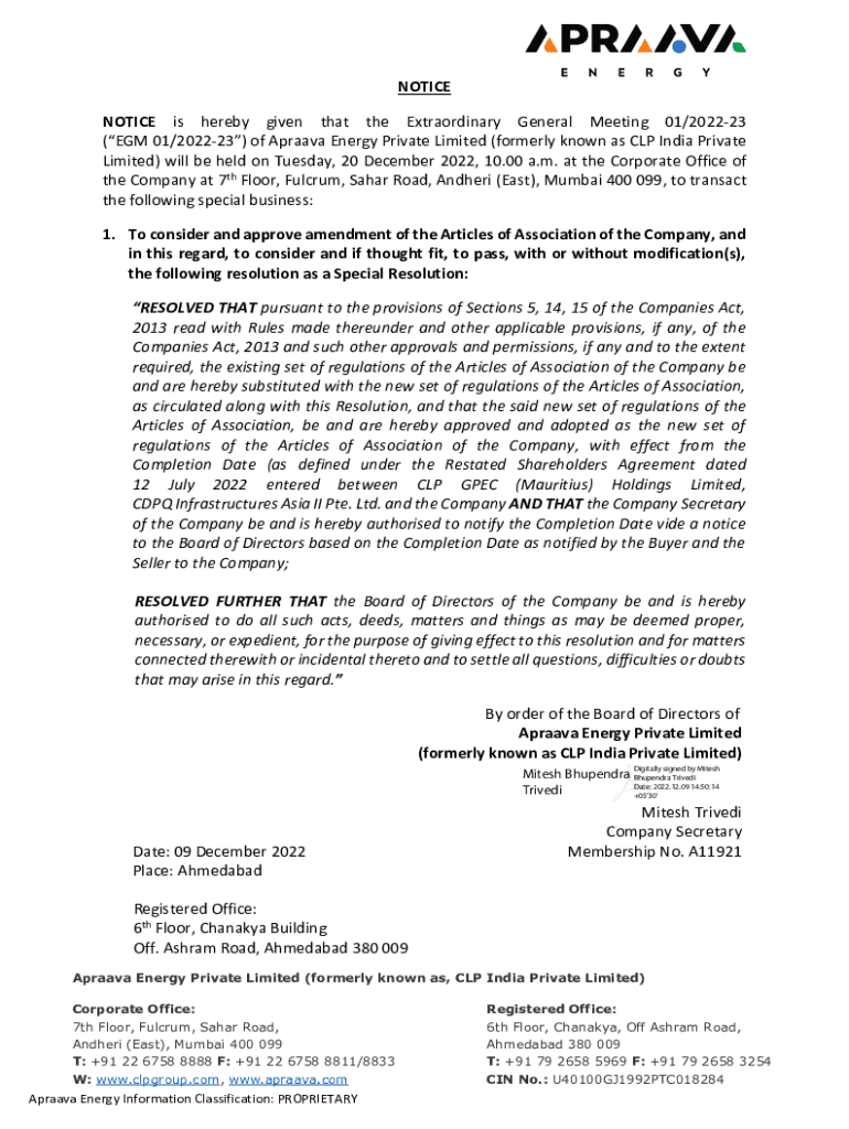 NOTICE is hereby given that the Extraordinary General Meeting 01/202223 (EGG 01/202223) of Arabia Energy Private Limited (formerly known as CLP India Private Limited) will be held on Tuesday, 20 December
