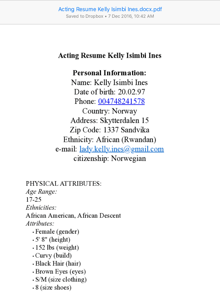 Acting Resume Kelly Nimbi Ines.docx.pdf Saved to Dropbox 7 Dec 2016, 10D42 Acting Resume Kelly Nimbi Interpersonal Information: Name: Kelly Nimbi Ines Date of birth: 20.02.97 Phone: 004748241578 Country: