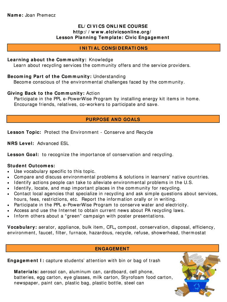 Name: Joan Prefect EL/CIVICS ONLINE COURSE http://www.elcivicsonline.org/ Lesson Planning Template: Civic Engagement INITIAL CONSIDERATIONS Learning about the Community: Knowledge Learn about recycling