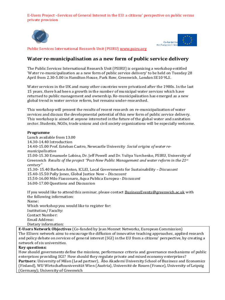 Users Project Services of General Interest in the EU: a citizens' perspective on public versus private provisionPublic Services International Research Unit (PS IRU) www.psiru.orgWater municipalization