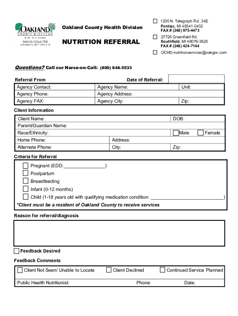 Oakland County Health Division1200 N. Telegraph Rd., 34E Pontiac, MI 483410432 FAX # (248) 9754473NUTRITION REFERRAL27725 Greenfield Rd. Southfield, MI 480763625 FAX # (248) 4247144 OCHDnutritionservices@oakgov.comQuestions?