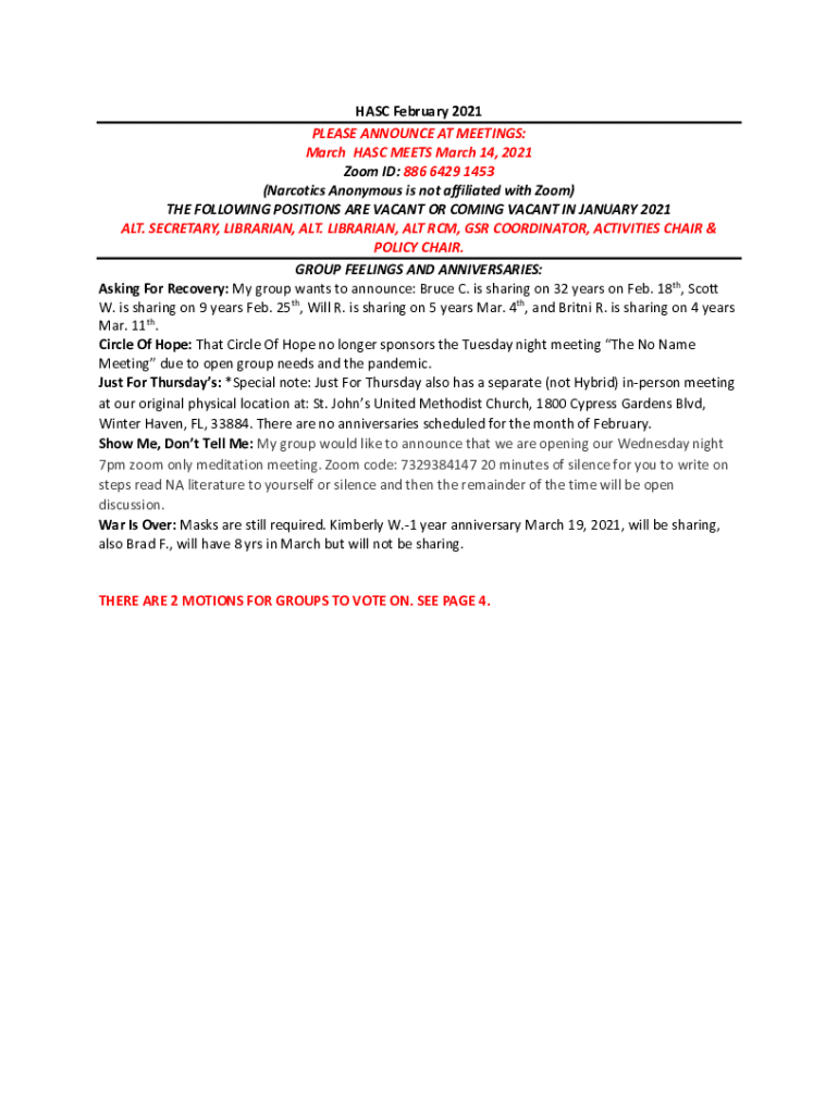HAS February 2021 PLEASE ANNOUNCE AT MEETINGS: March HAS MEETS March 14, 2021, Zoom ID: 886 6429 1453 (Narcotics Anonymous is not affiliated with Zoom) THE FOLLOWING POSITIONS ARE VACANT OR COMING