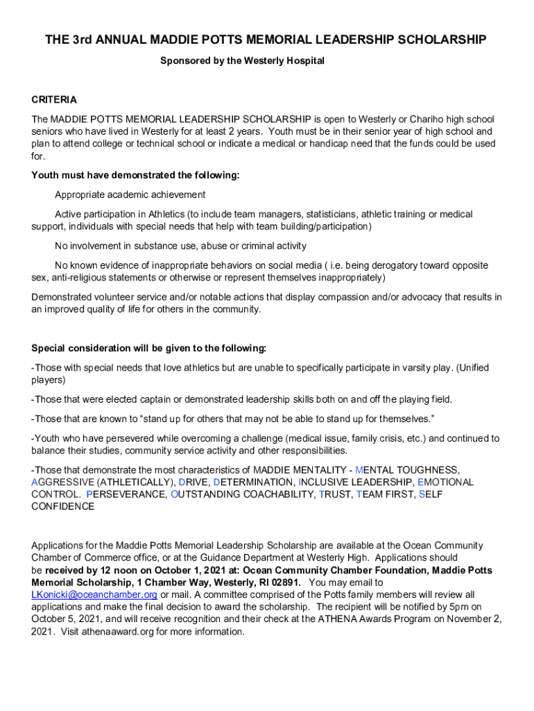 THE 3rd ANNUAL MADDIE POTTS MEMORIAL LEADERSHIP SCHOLARSHIP Sponsored by the Westerly Hospital CRITERIA The MADDIE POTTS MEMORIAL LEADERSHIP SCHOLARSHIP is open to Westerly or Charity high school