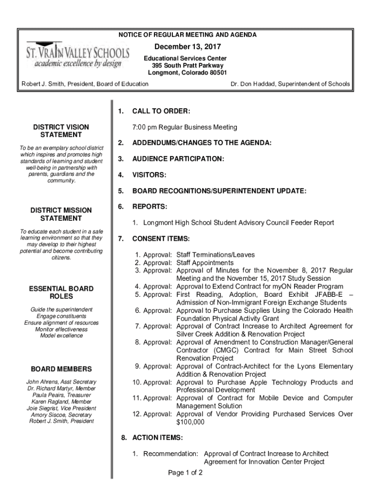 NOTICE OF REGULAR MEETING AND AGENDA December 13, 2017, Educational Services Center 395 South Pratt Parkway Longmont, Colorado 80501 Robert J. Smith, President, Board of Education1.DISTRICT MISSION