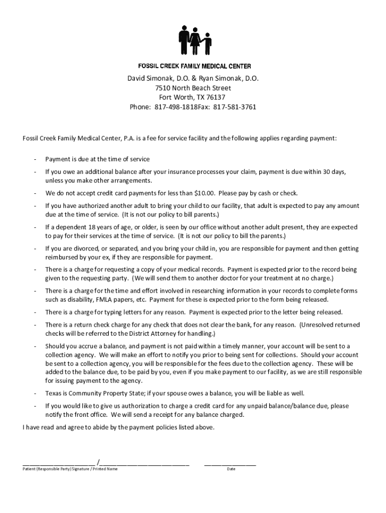 David Simona, D.O. & Ryan Simona, D.O. 7510 North Beach Street Fort Worth, TX 76137 Phone: 8174981818Fax: 8175813761Fossil Creek Family Medical Center, P.A. is a fee for service facility and the following