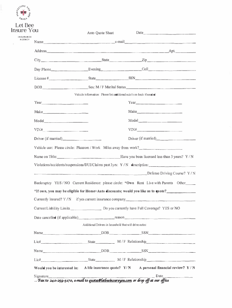 The Auto Quote Sheet includes multiple fillable fields, such as personal details, vehicle information, and driving history, making it user-friendly. Specific sections include: