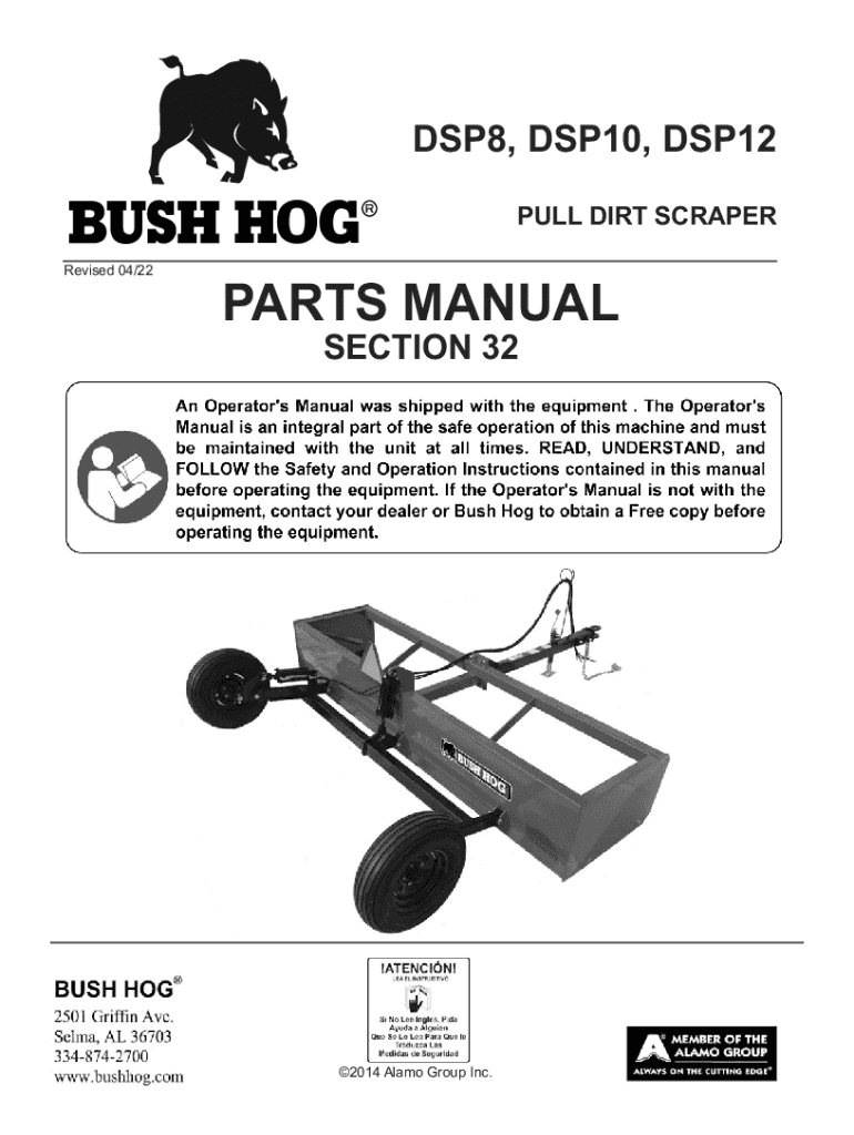 DSP8, DSP10, DSP12 PULL DIRT SCRAPER Revised 04/22PARTS MANUAL SECTION 322014 Alamo Group Inc. LIMITED WARRANTY Bush Hog warrants to the original purchaser of any new Bush Hog equipment, purchased
