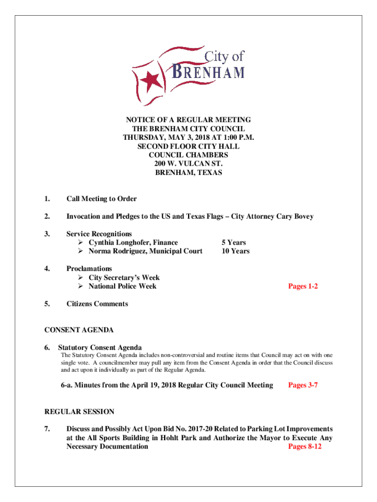 NOTICE OF A REGULAR MEETING THE BRENDAN CITY COUNCIL THURSDAY, MAY 3, 2018, AT 1:00 P.M. SECOND FLOOR CITY HALL COUNCIL CHAMBERS 200 W. VULCAN ST. BRENDAN, TEXAS1. Call Meeting to Order2. Invocation