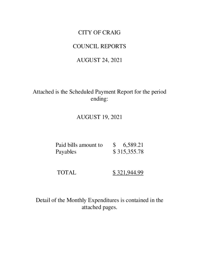 CITY OF CRAIG COUNCIL REPORTS AUGUST 24, 2021Attached is the Scheduled Payment Report for the period ending: AUGUST 19, 2021Paid bills amount to Payables $6,589.21 315,355.78TOTAL$ 321,944.99Detail