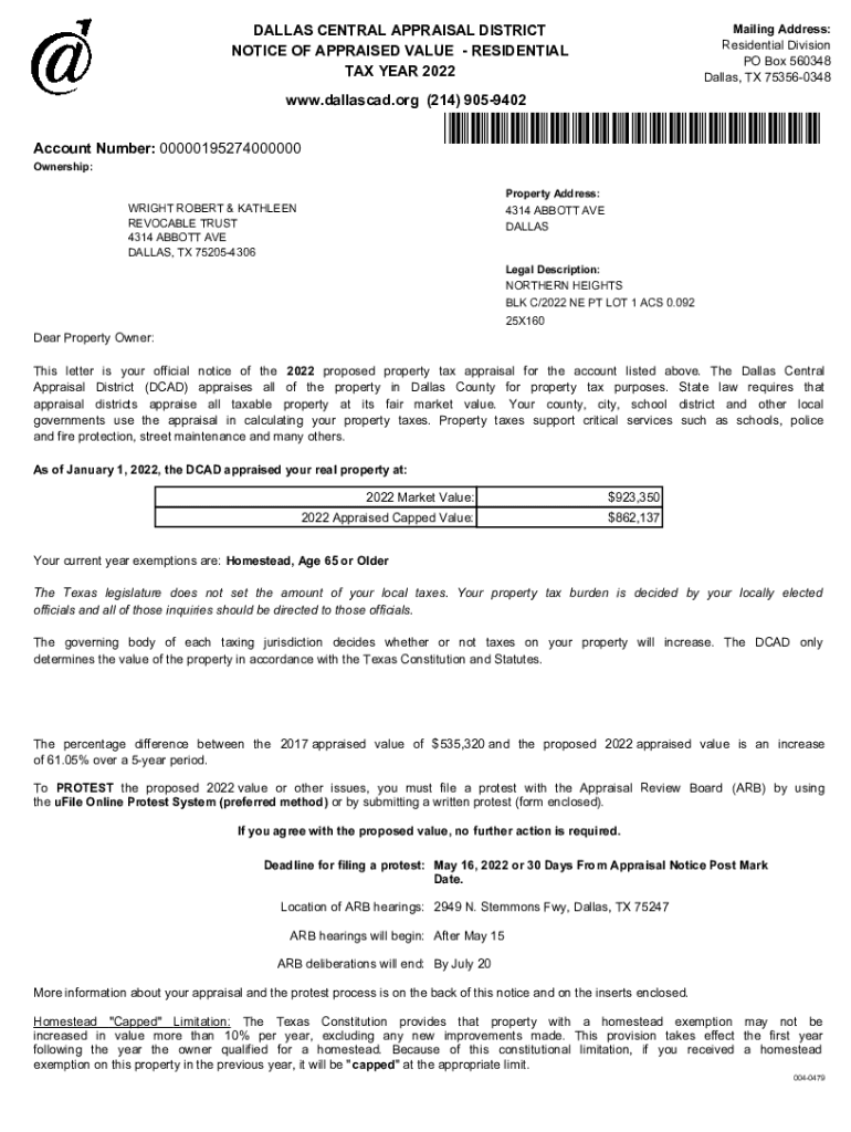 Mailing Address: Residential Division PO Box 560348 Dallas, TX 753560348DALLAS CENTRAL APPRAISAL DISTRICT NOTICE OF APPRAISED VALUE RESIDENTIAL TAX YEAR 2022 www.dallascad.org (214) 9059402×00000195274000000×Account