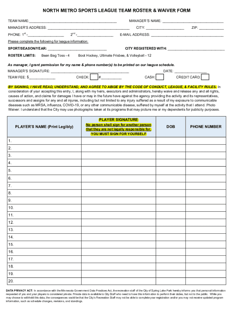 Get the free North Metro Sports Association - Team Roster & Waiver Form