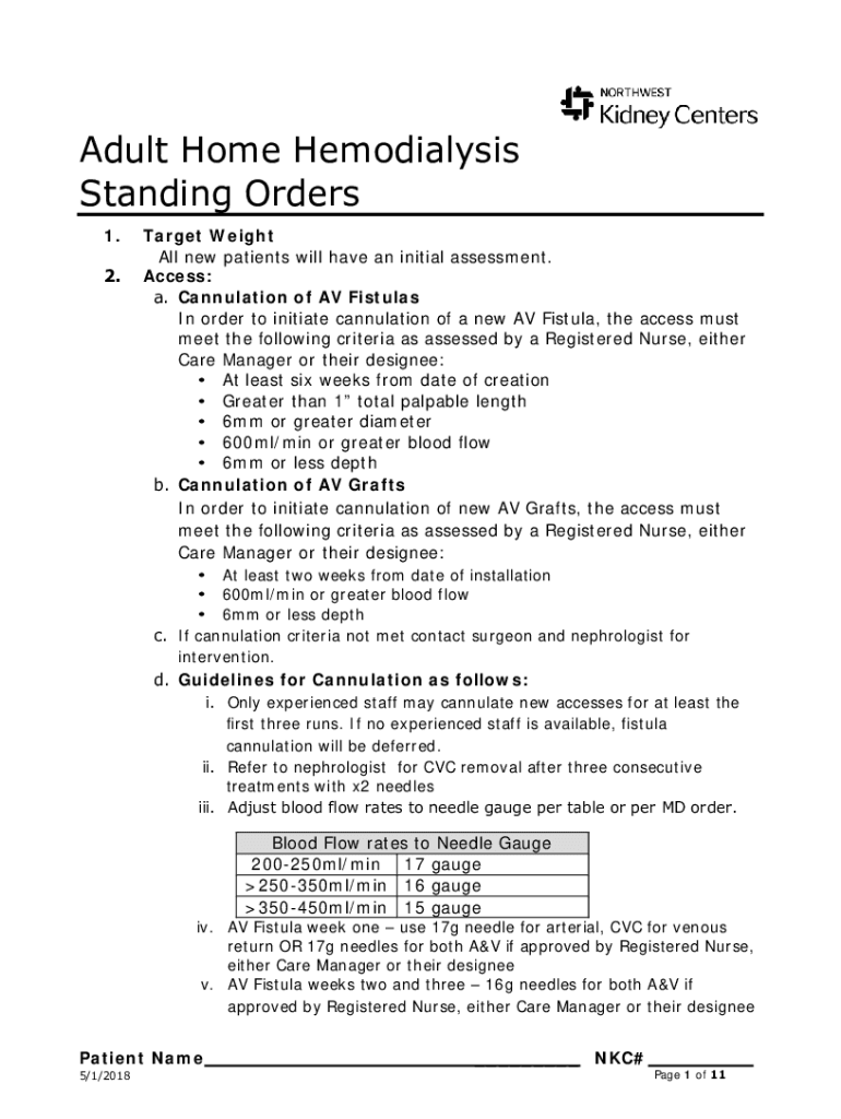 Adult Home Hemodialysis Standing Orders 1. 2. Target Weight All new patients will have an initial assessment. Access: a. Cannulation of AV Fistulas In order to initiate cannulation of a new AV Fistula,