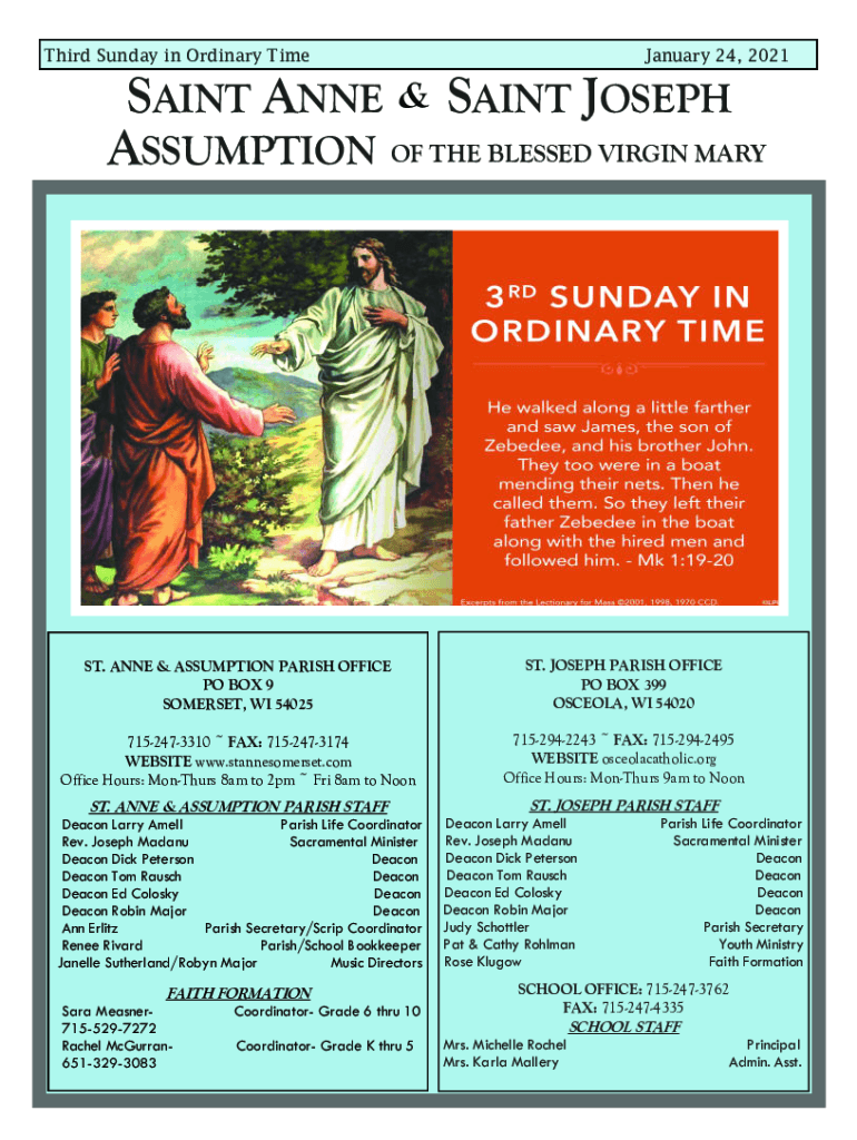 Third Sunday in Ordinary Time January 24, 2021SAINT ANNE & SAINT JOSEPH ASSUMPTION OF THE BLESSED VIRGIN MAYST. ANNE & ASSUMPTION PARISH OFFICE PO BOX 9 SOMERSET, WI 54025ST. JOSEPH PARISH OFFICE